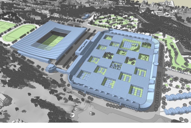 všesportovního stadionu se šachovnicovým, částečně zastřešeným