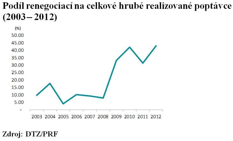Pro řadu firem je překážkou stěhování. Tento proces mají spojený s vyššími náklady i časovými investicemi. Pronájem nových prostor tak musí nájemcům dávat i s těmito výdaji jednoznačnou finanční logiku,“ vysvětluje Pavel Domalewski z DTZ. V posledním čtvrtletí roku 2012 se tak renegociace na souhrnném objemu transakcí podílely 45 %, přičemž podobně tomu pravděpodobně bude i v prvních měsících letošního roku.