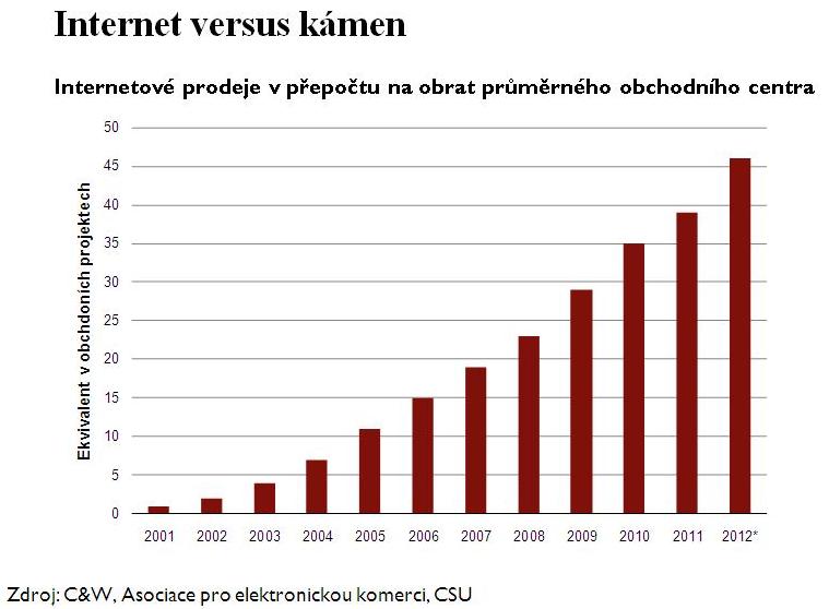 Naši internetoví prodejci dosáhli v roce 2012 stejného obratu jako 46 průměrných „kamenných“ obchodních center. Přes internet se u nás loni prodalo zboží za 43 miliard korun. Z analýzy, kterou zpracovala poradenská společnost Cushman & Wakefield na základě vlastního šetření, údajů Asociace pro elektronickou komerci a z dat Českého statistického úřadu, přitom vyplývá, že posuny v této oblasti jsou značné, ale nikoli tak revoluční, jak se občas prezentuje – za uplynulých deset let se objem internetového prodeje sice mnoha násobně zvýšil, ale celkově na něj připadá stále jen 5 % domácího maloobchodního obratu.