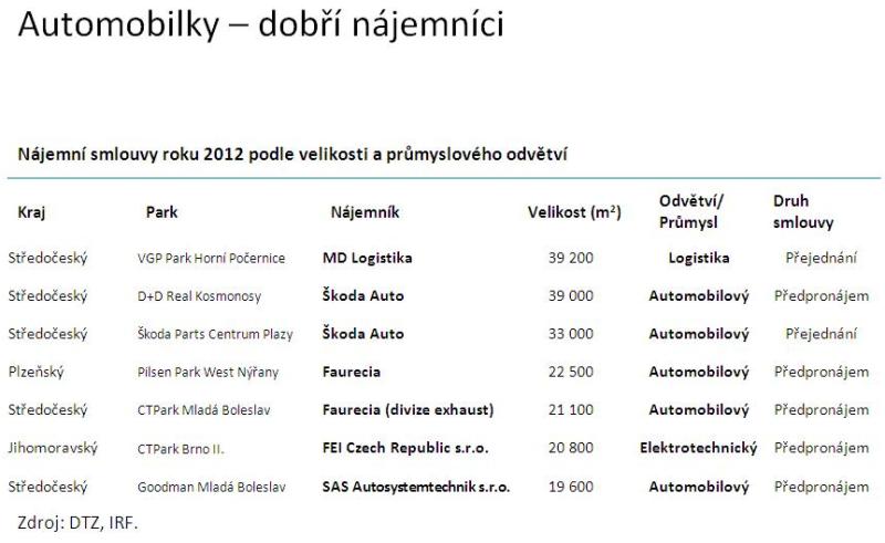 Mezi nejvýznamnější pronájmy „automobilové“ pronájmy se řadí smlouva pro společnost Škoda Auto (39 000 metrů čtverečních) v D+D Real Kosmonosy nebo již zmíněná firma Faurecia a její nové prostory v CTParku Mladá Boleslav (21 000) a v Pilsen Park West Nýřany (22 500). Pokud by ovšem propad prodeje automobilů v Evropě pokračoval dále, je nepravděpodobné, že společnosti v automobilovém průmyslu budou nadále poptávat nové skladové a výrobní prostory v takto velkých objemech.