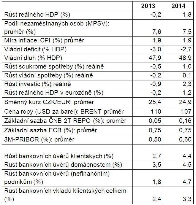 Přes určitou a vzhledem k okolnostem pochopitelnou nejasnost letošního vývoje, prognostici ČBA relativně optimistický výhled rok 2014 nemění. Za předpokladu naplnění prognózy ČBA pro letošek by rok následující měl přinést urychlení růstu ekonomiky (pro HDP zvýšení 1,8 %) a souběžné viditelnější zlepšení situace na trhu práce, byť zpožděné a jen pozvolné. A to vše by mělo jít ruku v ruce s větším zájmem o investice – u domácností by to mělo přinést vzrůst jejich spotřeby o 1 %. (Ministerstvo financí, jehož předpověď byla publikována rovněž v závěru týdne, se s ČBA víceméně shoduje v odhadech soukromé spotřeby, stran růstu HDP je ovšem střízlivější, podle MF dosáhne jen 1 % a opačně vidí trh práce – tam se míra nezaměstnanosti zvýší ze 7,6 % letos na 7,7 % v roce 2014.)