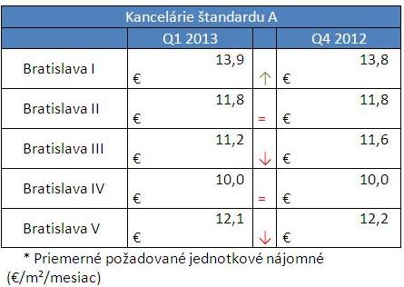 Požadovaná výška priemerného čistého nájmu kancelárií štandardu A v porovnaní so 4. kvartálom 2012 v Bratislave III a II zaznamenala mierny pokles, v Bratislave I mierny nárast.