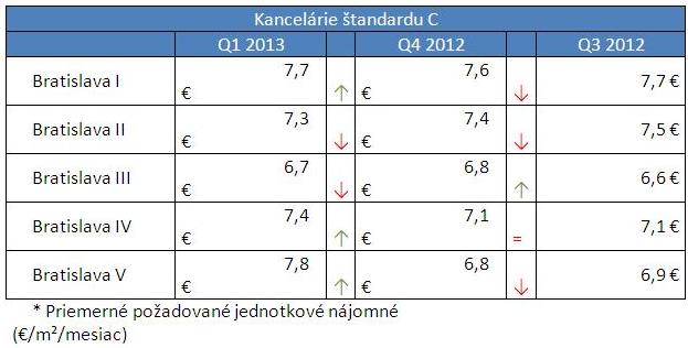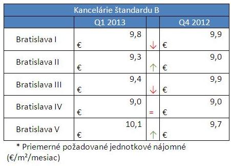 Požadovaná výška priemerného čistého nájmu kancelárií štandardu B v porovnaní so 4. kvartálom 2012 v Bratislava I a III zaznamenala mierny pokles, v Bratislave II a V mierny nárast.