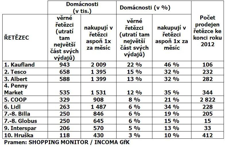 Těchto pět nejsilnějších obchodních řetězců preferuje jako hlavní nákupní místo téměř přesně 70 % českých domácností, přičemž na první tři nejsilnější připadá 50 % českých, moravských a slezských domácností.