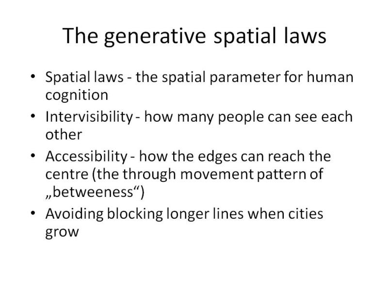 Pozornost veřejnému prostoru, která je pro současný urbanismus bezesporu signifikantní, a tzv. holistický přístup k plánování jeho rozvoje zákonitě vyvolal vznik nových metod a instrumentů. S jedním z nich konferenci seznámila Akkelies van Nes z z delftské Technologické univerzity. Koncept prostorové či městské syntaxe je založen na analýze prostorových vlastností reálné či plánované uliční sítě a na jejích kvalitách z hlediska pěšího pohybu obyvatel města. Pod takovým zorným úhlem se ulice přemění na osy hlavní, vedlejší a „slepé“, přičemž tato kvalita se nesporně odráží na jejich sociálním a ekonomickém životě včetně třeba výskytu kriminality. (Strašlivým příkladem nerespektování tohoto jevu je horní část Václavského náměstí, respektive silniční a takřka smrtící smyčka kolem Národního muzea.) Zdá se být nesporné, že taková analýza pohybových tras městské populace může být pro územní plánování nanejvýš užitečným nástrojem.