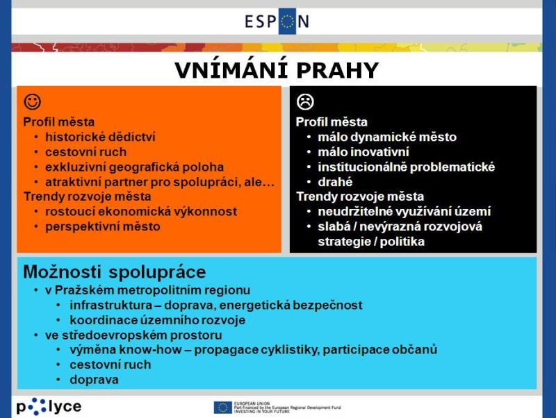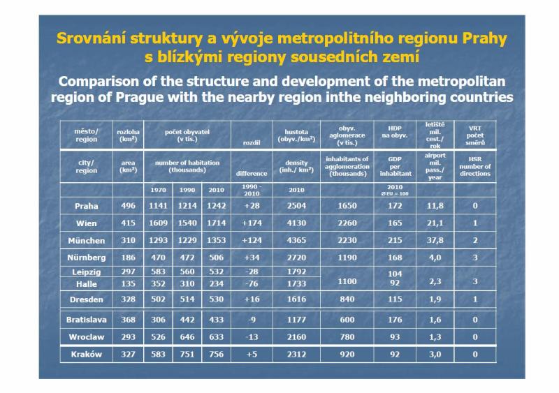 Z trochu jiné strany ne zcela uspokojivou situaci našeho územního plánování potvrdil Karel Maier z ČVUT. Ten na konferenci představil unijní srovnávací studii rozvoje středoevropských metropolí. V evropském kontextu na tom náš region není špatně, ba dokonce je v řadě parametrů nadprůměrný (včetně ekonomické úrovně), ale třeba z hlediska image je Praha vnímána jako město s výraznými deficity: málo dynamické a inovativní a také s nejasnou a málo konkrétní rozvojovou strategií. To souvisí s jeho hlavní slabinou – s problematickou a nevěrohodnou politickou scénou Prahy.