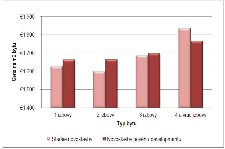 Priemerná cena ponúkaných bytov v novostavbách je momentálne na úrovni 1,683 eur za m2, čo predstavuje nárast o necelých päť eur oproti cenám v júni 2012. Pri predaných bytoch nastal taktiež nárast – priemerná cena za m2 narástla oproti prvému polroku 2012 o dve eurá. Najlacnejšie za m2 sú dnes 1,5 – 2,5 izbové byty, ktorých priemerná cena je nižšia ako 1,500 eur. Priemerné ceny všetkých ostatných typov bytov sú za m2 vyššie ako 1,600 eur.