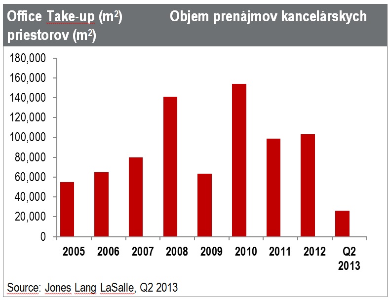 Na prelome kvartálov – mesiacov jún-júl boli na trh dodané dve nové kancelárske budovy, Hamilton House (2,400 m2) na Rajskej ulici a Forum Business Center (18,300 m2) na Bajkalskej ulici, čím bolo na trh dodaných 20,700 m2 novej kancelárskej plochy v štandarde A. Týmto sa navýšil podiel nových kancelárskych priestorov štandardu A na celkových 58,5%, zvyšných 41,5% predstavujú kancelárie štandardu B. Naopak značne sa znížila miera neobsadenosti z pôvodných 14.3% v predošlom kvartáli, keď ku koncu druhého kvartálu 2013 dosiahla 13.6%. Najnižšia miera neobsadenosti bola zaznamenaná v Bratislave I (12.0%), nasledovaná Bratislavou V (12.8%) a Bratislavou IV (13.5%). Objem uzatvorených transakcií počas 2. kvartálu dosiahol výmeru 25,936 m2, čo v porovnaní s prvým kvartálom minulého roku predstavuje nárast o približne 14.5%, oproti predošlému kvartálu 2013 ide o nárast o 29.9%. Novouzavreté nájomné zmluvy tvorili 60.5% z celkového dopytu, zvyšok tvorili renegociácie.
