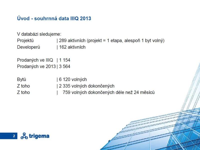 Statistiky Trigemy v posledním kvartálu tohoro roku zachytily v Praze 289 „aktivních“ bytových projektů (aktivita znamená nabídku nejméně jednoho bytu) od 162 developerských firem. Zdá se, že okruh producentů či dodavatelů je dostatečný, možná až příliš široký. Rozklíčování tohoto údaje a jeho sledování na časové ose ale přináší závěr přesně opačný. Čísla o zahajování projektů a tedy i perspektivní výstavbě jasně ukazují, že opravdu aktivních, tedy „vyrábějících“ developerů je dnes jako šafránu a číslo 162 je spíše echem někdejších zlatých časů. Letos nový projekt nabídlo jen 27 společností, když loni jich bylo 42 a v roce 2010 dokonce 60. V důsledku recese řady developerů tedy zjevně řídnou. „A pokud bychom mluvili o společnostech, které v posledních letech nový projekt nabídly každý rok, pak jich napočítáme jen devět,“ komentuje tato čísla Marcel Soural.