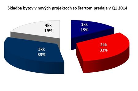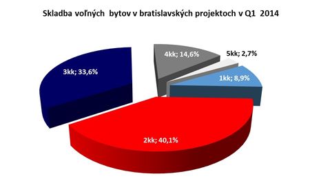 V nových projektoch, ktoré na trh prišli počas prvého štvrťroku 2014, sú rovnakým, približne tretinovým podielom zastúpené dvojizbové (okres BA II a BA V) a trojizbové byty (okres BA I, BA II a BA IV). Celkovo je na trhu najviac dvojizbových bytov. Tvoria približne 40% ponuky, trojizbové byty predstavujú tretinu z ponuky voľných bytov v Bratislavských projektoch.