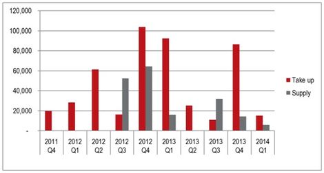 V prvom štvrťroku 2014 miera neobsadenosti nepatrne narástla o 1,0% na súčasných 6,54%. Aktuálny stav voľnej priemyselnej plochy na prenájom je nasledovný – širšie okolie hlavného mesta stále ponúka najväčší objem (53,030 m²), nasleduje západné Slovensko (13,000 m²), stredné Slovensko (7,600 m²) a východné Slovensko (6,850 m²).