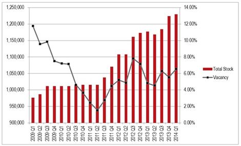 Celková plocha priemyselných a logistických priestorov v prvom kvartáli 2014 dosiahla úroveň 1,229,811 m². V porovnaní s predchádzajúcim štvrťrokom, je zmena len minimálna.