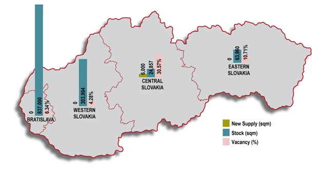 Najväčším priemyselným regiónom naďalej zostáva Bratislava a širšie okolie s 68,1% z celkovej prenajateľnej industriálnej plochy na Slovensku.