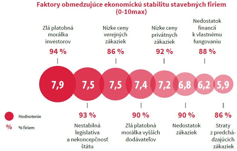 „Zlá platobná morálka zadávateľov stavebných prác v kombinácii so zložitou vymožiteľnosťou práva je pre mnoho firiem smrtiaca kombinácia. V mnohých prípadoch už nepomáhajú ani prísľuby ďalších zákaziek a niektorí subdodávatelia odmietajú dodávať i tým najväčším firmám bez zaistenia úhrady vopred. Im samotným totiž už kriticky chýbajú peniaze na mzdy zamestnancov, či úhrady dodávateľom materiálu, bez ktorých nie sú schopni fungovať,“ približuje aktuálnu situáciu na trhu Jiří Vacek, riaditeľ analytickej spoločnosti CEEC Research. To potvrdzuje i Magdaléna Dobišová, generálna riaditeľka spoločnosti Skanska SK: „Hlavným problémom je platobná morálka, a to tak investorov, ako aj dodávateľov navzájom.“ Rovnako to vidí i výkonný riaditeľ spoločnosti Ramirent, ktorá zaisťuje pre stavebné firmy požičiavanie techniky a mechanizácie, Libor Taglicht: „Platobná morálka je bohužiaľ úplne tristná. Najsmutnejšie na tomto nenormálnom stave je, že ho drvivá väčšina dlžníkov považuje za normálny. Skúste kontaktovať vášho dlžníka 2 týždne po splatnosti faktúry. Odpoveďou Vám nebudú ospravedlnenia a pravdivé ubezpečenie o práve uskutočnenej platbe. Skôr si vypočujete vyhrážanie, že prerušia Vašu vzájomnú spoluprácu a neustále opakovanie, že je to „ predsa úplne normálne.“