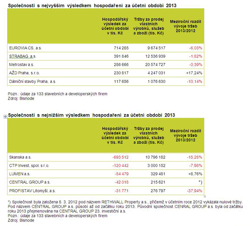 Ačkoliv tuzemská ekonomika vykazuje známky oživování, stavebnictví a development, jedny z nejdůležitějších odvětví národního hospodářství, pokračují v propadu. Společnost Bisnode v rámci analytické studie Stavebnictví a development hodnotila hospodaření 133 nejvýznamnějších hráčů na trhu. Jejich celkové tržby se v letech 2011 až 2013 snížily o 13,7 % na 157,8 mld. Kč a zisk propadl o 58,1 % na 3,4 miliardy. Navíc ve stavebnictví podniká 23 % rizikových subjektů, což je o 9 % více činí průměr této rizikovosti v rámci celé české ekonomiky.