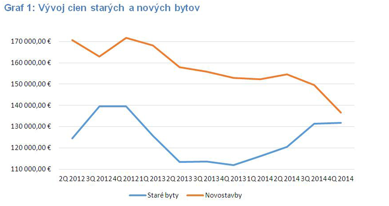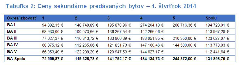 Aj v poslednom štvrťroku 2014 pokračoval medziročný rast cien starších bytov. V porovnaním s koncom roka 2013 boli o 17,8% drahšie. Najvýznamnejšie rástli medziročne ceny, o viac ako 15 %, v mestských častiach Nové Mesto, Ružinov, Staré Mesto, ale aj v Dúbravke a Karlovej Vsi. Kým v častiach Ružinov a Nové Mesto rástli absolútne ceny v dôsledku rastu priemernej ceny na meter štvorcový, v ostatných častiach mal na rast cien najvýznamnejší vplyv vyšší podiel väčších bytov(v porovnaní s predchádzajúcim sledovaním) v ponuke.