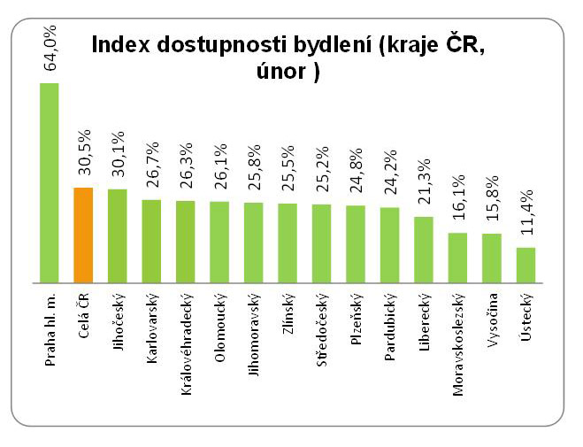 V absolutních číslech nejlepší, respektive nejvyšší míru dostupnosti dlouhodobě vykazuje Ústecký kraj (11,4 %), Moravskoslezský (15,5 %) kraj a Vysočina (16,1 %). Naopak největší zátěž pro rozpočet domácnosti znamená pořízení bytu v Praze, kde průměrná cena bytů za posledních 12 měsíců vzrostla o 410 000 Kč a aktuálně činí 4,38 mil. Kč. Pražské domácnosti i při svých standardně vyšších příjmech (v porovnání se „zbytkem“ republiky) vynaloží na splátku hypotéky více než polovinu svých průměrných čistých příjmů.