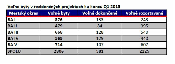 Úspešný koniec roka 2014 predpokladal trvanie trendu predaja, ako aj výstavby bytových projektov v roku 2015. Túto skutočnosť potvrdil prieskum realitného trhu za prvý kvartál tohto roku. Každá mestská časť zaznamenala prírastok aspoň jedného nového projektu, spolu ide o ponuku 543 bytových jednotiek v šiestich rezidenčných projektoch, pričom hneď 153 z nich zaznamenalo aktívny dopyt zo strany kupujúcich v sledovanom období a stali sa tak predmetom kúpy. Najvýraznejšie sa na tejto skutočnosti podieľal projekt Nobelova, Miletičova 60 a Rezidencia Blumentál. Dokončenie výstavby sa vo väčšine týchto nových projektov predpokladá na rok 2016. Develeperi zareagovali na požiadavky trhu zo strany dopytu a v celkovej ponuke rezidenčných projektov sa objavili prevažne dvoj- a trojizbové byty. Päťizbové byty predstavujú obmedzenú ponuku a v niektorých mestských častiach sa ani v štruktúre nových bytových domov neobjavili.