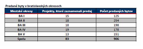 Predaj bytov v prvých troch mesiacoch roku 2015 najviac zarezonoval v druhom bratislavskom okrese, ktorý zaznamenal 254 predaných bytov. Za ním bol v počte predaných bytov tretí bratislavský okres spolu so 198 bytovými jednotkami. Oproti štvrtému kvartálu minulého roku si polepšil v predaji o 61 bytových jednotiek štvrtý bratislavský obvod s predanými bytmi spolu v počte 178. Piaty bratislavský okres vzrástol v predaji o 6,5% a dosiahol tak 164 predaných bytov. Najmenej bytov v porovnaní mestských častí v celkovom počte 125 sa predalo v Starom Meste. Zistený predaj bol realizovaný v 83 developerských projektoch.