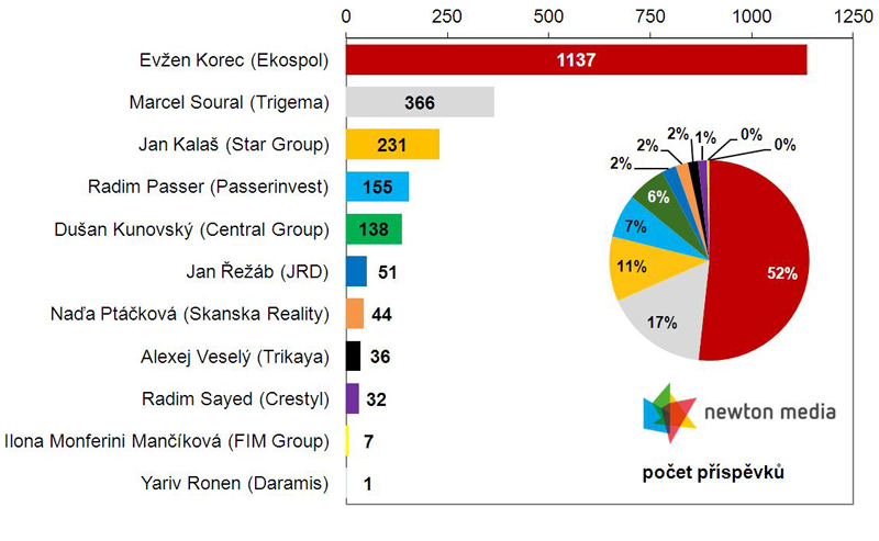 Evžen Korec se během minulého roku ocitl 24 x v titulku, 13 x na titulní straně (typicky E15, MF Dnes), 37 x v agenturním zpravodajství ČTK a 3 x v hlavní zpravodajské relaci na ČT 1. A tak developerskému mediálnímu přeborníkovi odolávají snad už jen rozhlas a „lifestyle print“. Stejně jako v minulosti pojímal svou komentátorskou gesci vcelku velkoryse, když do ní zahrnul DPH, stavební zákon, kurz koruny i proceduru EIA.
