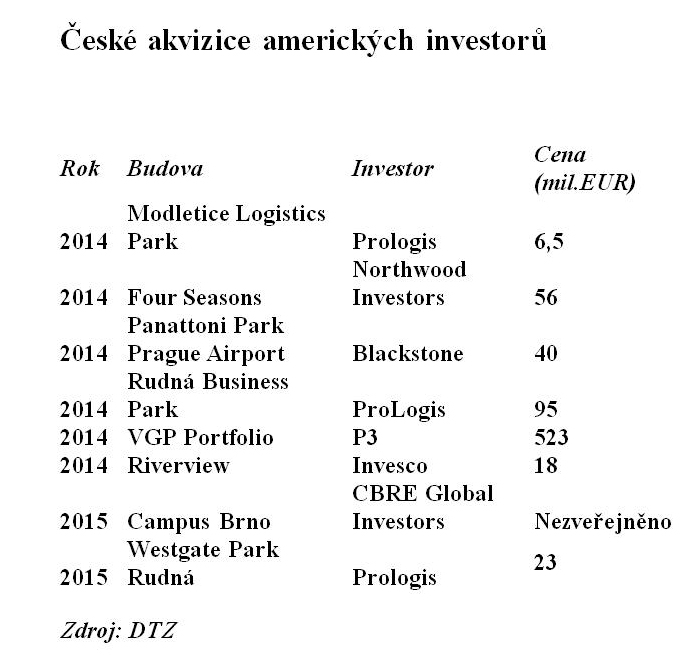 Deset i patnáct nabídek koupě na jednu komerční nemovitost. Taková je realita českého investičního trhu v roce 2015. Podle mezinárodní poradenské společnosti DTZ mají o evropské i české kancelářské, obchodní nebo logistické objekty stále větší zájem investoři ze zámořských destinací – hlavně ze Spojených států amerických a Asie. A daří se jim i díky značným kapitálovým zdrojům oslabovat pozici tradičních, tedy evropských, investorů.