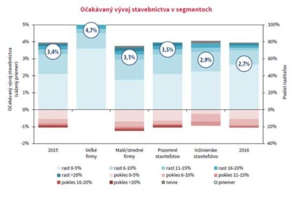 Riaditelia viac než stovky stavebných spoločností očakávajú vyšší objem stavebnej produkcie tiež v roku 2016 a to o 2,7 percenta. Zvýšenie výkonu očakávajú zástupcovia hlavne inžinierskeho staviteľstva (3,7 percenta), ostatné segmenty majú predikcie rastu pre budúci rok veľmi podobné: cez dve percentá. „Je vysoký predpoklad, že rast stavebného sektora bude pokračovať. Predovšetkým dopravné staviteľstvo a sektor vodohospodárskych stavieb, ktoré súvisí s dočerpaním fondov EÚ v jednotlivých operačných programoch. Pozitívum je, že potenciál stavebného trhu umožní zvýšenie zamestnanosti, využitie technologického potenciálu stavebných firiem. Negatívum môže nastať z kapacitného nedostatku odborného personálu pri avizovanom objeme nových súťaží v r. 2015–2016,“ dodáva Miroslav Beka, riaditeľ organizačnej zložky Slovensko divízia Dopravné stavby, HOCHTIEF CZ, a. s.