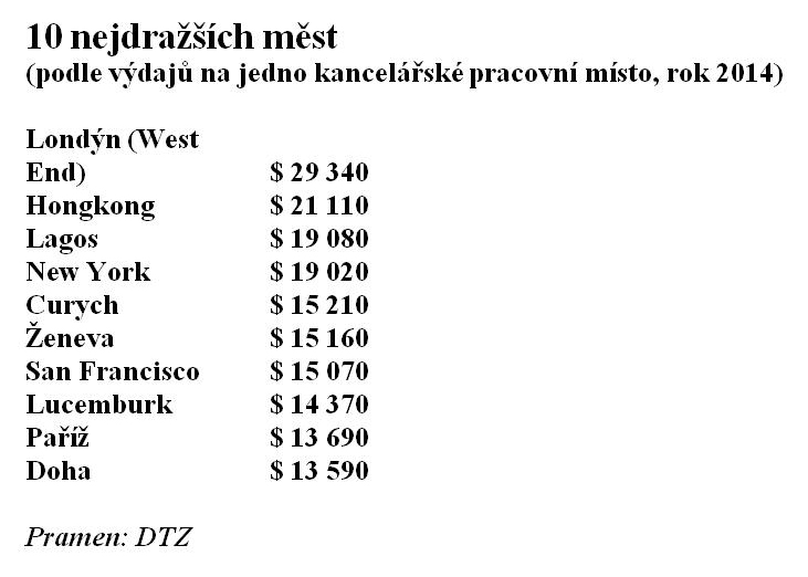 Z analýzy DTZ vyplynulo zajímavé zjištění: celosvětově náklady na jedno kancelářské místo loni klesly o 4,4 %. Jednotlivé kontinenty, nebo dokonce i regiony, však v tomto ohledu vykazovaly značné rozdíly. Strmě rostou „kancelářské“ náklady na trzích na Blízkém východě a v Africe, přičemž ale totéž platí pro Londýn nebo Dublin, kde v loňském roce došlo ke zvýšení nákladů o 16 %, respektive o 27 %. Právě londýnský West End je vůbec nejdražším místem pro provoz kanceláří na světě – náklady na jedno pracovní místo tady v roce 2014 dosáhly úrovně 29 000 amerických dolarů a mají navíc tendenci dále stoupat. Jen pro srovnání, druhým nejdražším městem z tohoto hlediska je asijský Hongkong, kde obdobné výdaje činí 21 100 dolarů.
