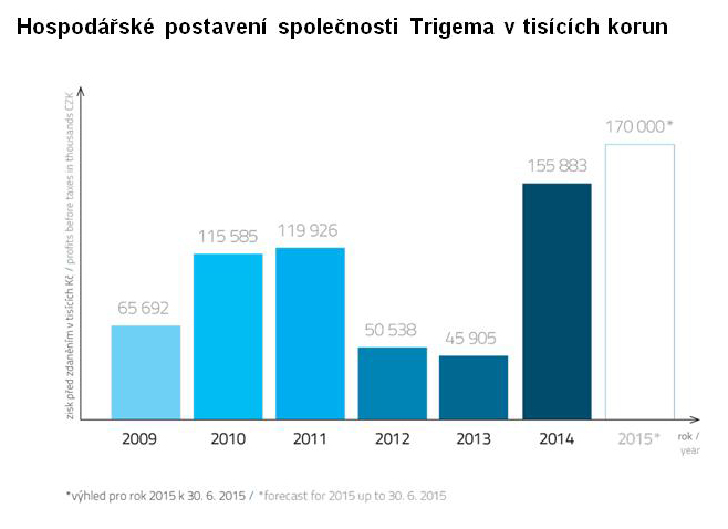 Zisk před zdaněním společnosti Trigema činil za uplynulých dvanáct měsíců 155 883 tisíc korun. Pro srovnání: o rok předtím to bylo 45 905 tisíc korun. Letos by měl být zisk před zdaněním minimálně na stejné úrovni jako vloni.