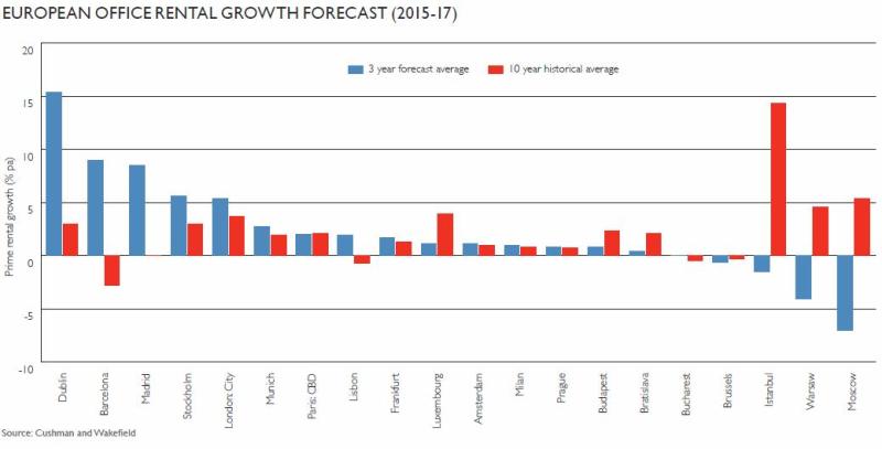 Predpovede výkonnosti v strednej a východnej Európe sú vo všeobecnosti viac tlmené, pričom v troch zo siedmych trhov sa predpokladá pokles nájomného v rokoch 2015–2017 a zároveň päť trhov zaznamená zmenu nájomného, nižšiu ako je desaťročný priemer. Vzhľadom k tomu, že ekonomiky mnohých krajín v strednej a východnej Európe sú relatívne zdravé a predpokladá sa, že ich vývoj ostane pozitívny, developeri a investori stavajú viac projektov a ďalšie projekty plánujú, to všetko ale prevyšuje očakávaný dopyt nájomcov. Ako výsledok toho sa predpokladá, že nájomné v prvotriednych priestoroch bude pod tlakom smerom nadol, presnejšie v mestách ako Moskva, Varšava a Istanbul. V Moskve sa ďalej očakáva najnižší nárast nájomného v Európe v rokoch 2015–2017 a to na základe často medializovaným sankciám a nízkej ceny ropy, ktoré si vybrali svoju daň na obchodných vyhliadkach a dopyte nájomcov po priestoroch.