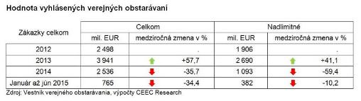 Verejní obstarávatelia, obstarávatelia a subjekty, ktorým bola poskytnutá dotácia v prvej polovici tohto roka vyhlásili celkom 979 zákaziek v celkovej hodnote 765 miliónov EUR. V porovnaní s rovnakým obdobím minulého roka objem prepadol viac než o tretinu (34,4 %). Z týchto zákaziek bola ukončená už desatina. Cena, ktorú stavebné firmy za svoju prácu ponúkli, bola ale o 14 % nižšia ako tá, za ktorú boli verejné obstarávania vyhlásené. Vyplýva to z najnovšej analýzy analytickej spoločnosti CEEC Research vypočítanej na základe údajov poskytnutých Úradom pre verejné obstarávanie ku koncu júna 2015.