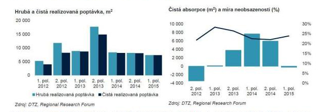 Z prvních šest měsíců tohoto roku byly podle údajů poradenské společnosti DTZ v Ostravě dokončeny dvě kancelářské budovy ve Vědecko-technologickém parku Ostrava – budovy VIVA a TRIDENT o celkové rozloze 5 298 m2. Ve výstavbě se nyní nachází Administrativní budova Vratimovská (3 000 m2) s předpokládaným dokončením ve druhé polovině roku 2015. Hrubá realizovaná poptávka včetně renegociací dosáhla v prvním pololetí 2015 celkem 7 300 m2, jedná se o meziroční propad o 12 % a o propad o 10 % v porovnání s 2. pololetím 2014. Jelikož se v Ostravě během prvního pololetí neuzavřela žádná renegociace, čistá realizovaná poptávka dosáhla stejného objemu, jako hrubá realizovaná poptávka. Míra neobsazenosti kancelářských ploch v severomoravské metropoli ke konci pololetí meziročně vzrostla o 1,9 % na 24 %. V první polovině roku 2015 celková výměra moderních kancelářských ploch v Ostravě 205 400 m2. Budovy třídy A představovaly 71 % celkové plochy a zbývajících 29 % tvořily kanceláře třídy B.