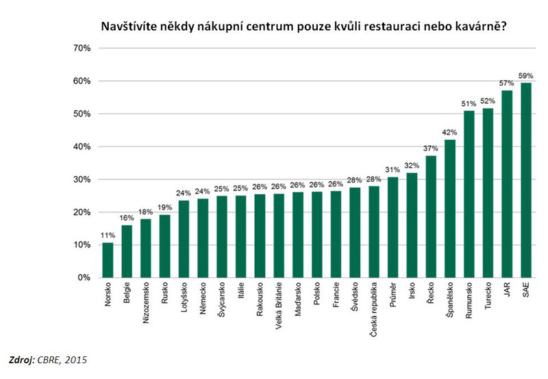 Z chování spotřebitelů je patrné, že významná část zákazníků již preferuje nákupní centrum před klasickým typem restauračního zařízení a právě navštívení místní restaurace nebo kavárny je primárním důvodem jejich příchodu do obchodního centra. Ve Spojených arabských emirátech, v zemích východní Afriky, v Turecku nebo v Rumunsku je to dokonce více než 50 % zákazníků. Obyvatelé České republiky jsou v tomto ohledu poněkud konzervativnější – u nás přichází do obchodních center za tímto účelem „jen“ 28 % jejich návštěvníků.