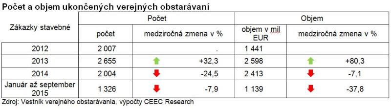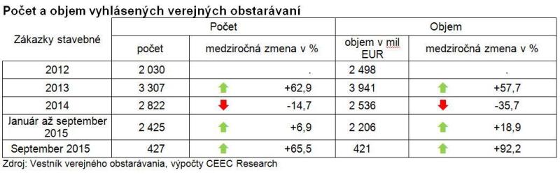 V prvých troch štvrťrokoch tohto roka stúpol objem vyhlásených verejných obstarávaní v porovnaní s rovnakým obdobím roka 2014 takmer o pätinu (18,9 percenta). Stavebné firmy sa tak mohli uchádzať o práce za 2,2 miliardy EUR. Oproti minulému roku tiež vzrástol počet vyhlásených verejných obstarávaní a to o 6,9 percenta na celkových 2 425 zákaziek. „Zatiaľ čo firmy, ktoré realizujú výstavbu v dopravnom sektore majú v súčasnej dobe kapacity dosť naplnené, v jesennej výstavbe sa toľko nedarí a rezervy pre realizáciu ďalších zákaziek stavebníci majú.,“ hovorí Mario Červenka, riaditeľ spoločnosti O.M.C. Invest.