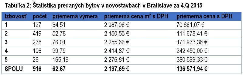 V poslednom štvrťroku 2015 sa v Bratislave predalo 916 bytov v novostavbách. V porovnaní s rovnakým obdobím roku 2014 sa predaj zvýšil o takmer 31%. V priebehu roka 2015 sa dovedna predalo 3 840 bytov v novostavbách, čo vychádza približne 10,5 predaného bytu denne. Najviac predajov (31,5%) sa realizovalo v Petržalke, najmenej (11,5%) v Starom Meste. Najlepšie sa na trhu stále predávajú dvojizbové byty. Ich podiel na celkovom predaji v Bratislave sa dlhodobo pohybuje nad 45%.