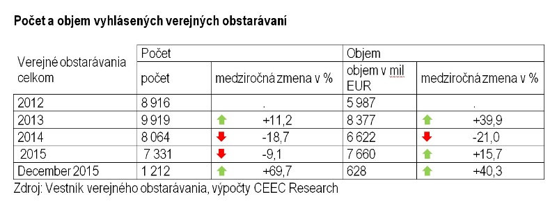 V roku 2015 vyhlásili investori celkom 7 331 obstarávaní, čo predstavuje rekordne najnižší ročný počet za posledné štyri roky, teda za sledované obdobie ( 8 916 v roku 2012, 9 919 v roku 2013, 8 064 v roku 2014). Oproti tomu objem investícií dosiahol v celkovej hodnote 7,7 miliardy EUR a medziročne tak vzrástol o 15,7 percenta. Aktivita investorov bola v počte ukončených verejných obstarávaní na rovnakej úrovni ako v predchádzajúcom roku, avšak ich celková hodnota zaznamenala výrazný tretinový pokles. Vyplýva to z najnovšej analýzy spracovanej analytickou spoločnosťou CEEC Research na základe údajov poskytnutých Úradom pre verejné obstarávanie ku koncu decembra 2015.