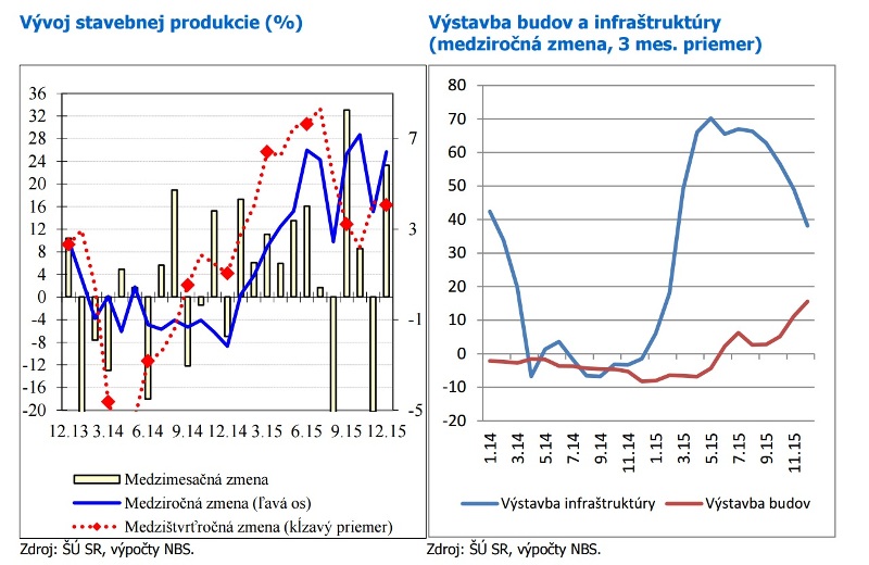 Rok 2015 bol veľmi priaznivý. Koncoročné odstávky spomalili decembrový priemysel (autá, hutníctvo), avšak za rok ako celok sa mu darilo (rast o 5,9%). Priaznivý vývoj by mal pokračovať (pozitívum je aj zrušenie skráteného pracovného týždňa v hutníctve). Stavebná produkcia po šiestich rokoch poklesu vzrástla o takmer 18 %. Darilo sa jej najmä kvôli výstavbe nových ciest a diaľnic (bez vplyvu novej infraštruktúry, financovanej najmä z eurofondov, by stavebníctvo vzrástlo v minulom roku o 3,5%).