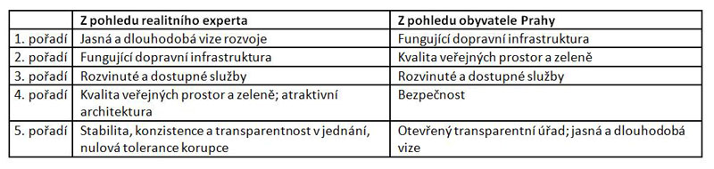 Zajímavé výsledky přineslo srovnání pěti nejdůležitějších kritérií, které měla Praha naplňovat, aby mohla být označena za evropskou metropoli. „U naprosté většiny dotazovaných se kritéria shodují jak z jejich pohledu aktéra na nemovitostním trhu, tak z pohledu občana a obyvatele Prahy,“ doplňuje Monika Kofroňová.