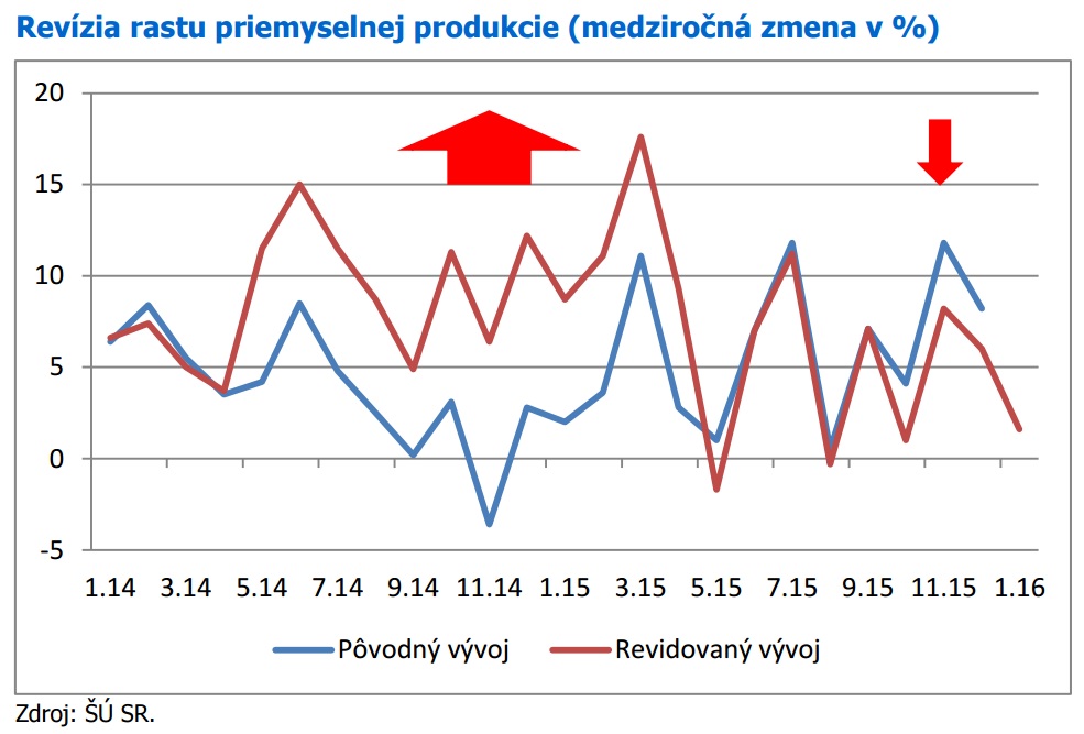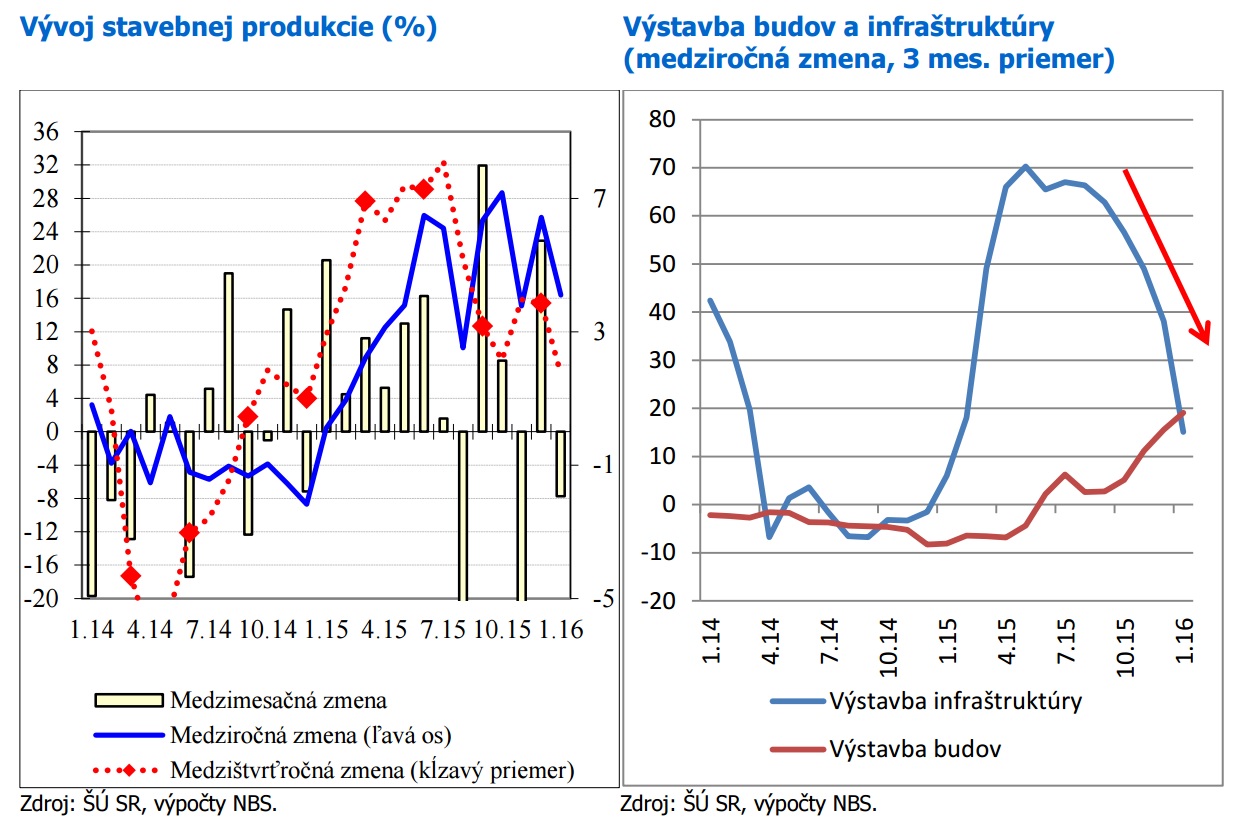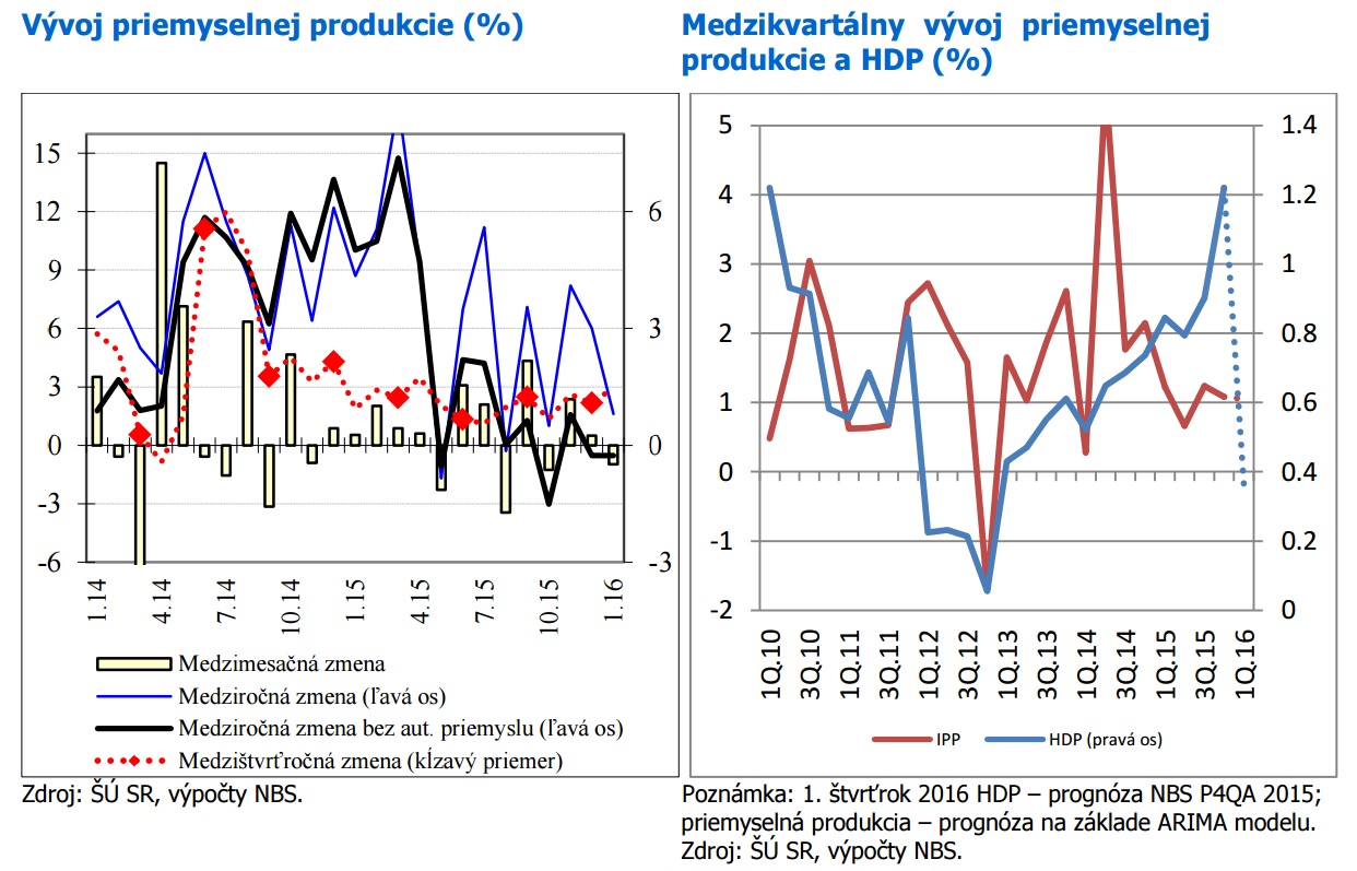 Začiatok roka 2016 prekvapivo ovplyvnil negatívny vývoj automobilového, a nie hutníckeho priemyslu. Slabší januárový vývoj pravdepodobne vo väčšej miere ovplyvnili odstávky a prestavovanie výrobných liniek na prelome rokov. Výraznejšiemu prepadu priemyslu zabránila výroba elektrotechniky. Utlmenie stavebnej produkcie najmä v prípade infraštruktúrnych projektov potvrdzuje očakávania o spomalení aktivity kvôli eurofondom.