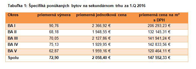 Tabuľka 1: Špecifiká ponúkaných bytov na sekundárnom trhu za 1.Q 2016