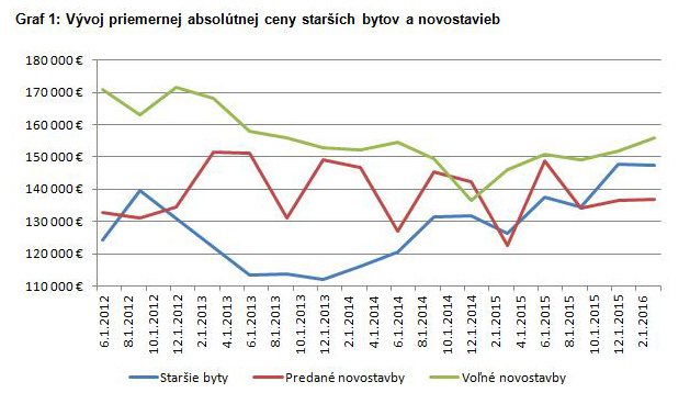 Graf 1: Vývoj priemernej absolútnej ceny starších bytov a novostavieb