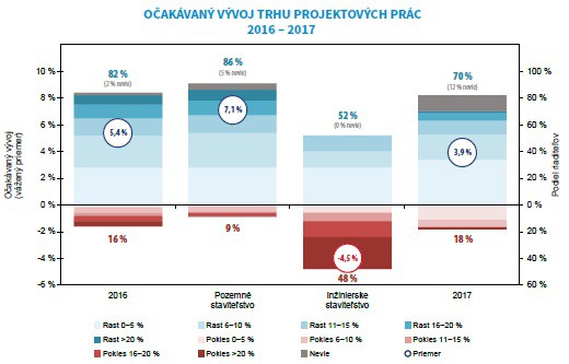 Projektové firmy a architektonické ateliéry budú mať v roku 2016 viac práce než pred rokom. Aktuálne očakáva rast výkonu v tejto oblasti osem z desiatich spoločností (82 percent), pričom priemerný rast by mal dosiahnuť 5,4 percenta. Veľké rozdiely v predpovediach sa však objavujú v závislosti na zameraní firmy. Zatiaľ čo drvivá väčšina (82 percent) spoločností pracujúcich na projektoch pre pozemné stavby predikuje rast o 7,1 percenta, firmy zaoberajúce sa projektami pre inžinierske staviteľstvo očakávajú pokles, a to dokonca až o 4,5 percenta. Sektoru projektových prác sa bude dariť aj v roku nasledujúcom. Riaditelia projektových kancelárií očakávajú v roku 2017 nárast zákaziek o 3,9 percenta, pričom v odbore pozemných stavieb pribudne práce o 4,4 percenta a v inžinierskych stavbách o 1,1 percenta. „Všetko závisí od faktorov doriešenia stále pretrvávajúceho stavu nedoriešenia problémov v oblasti legislatívy v stavebníctve a honorárových poriadkov pre projektantov, ktoré stále nie sú ničím uzákonené, sú informatívne a čím ďalej tým viac podceňované. Štát zasa sprísnil nároky na teplo technické vlastnosti novostavieb, verejných stavieb, a tým vlastne stanovil finančné prekážky pre majiteľov stavieb, ktorí už donedávna mali problém s financovaním stavieb kvôli nízkym finančným prostriedkom z fondov opráv. Navyše, banky sprísnili pravidlá na prideľovanie hypoték, a tak to nevidím príliš optimisticky, skôr naopak, bude sa prehlbovať kríza v stavebníctve. Finančná sila eura je nestabilná a nejasná,“ rozoberá súčasný stav sektora Mikuláš Hladký, architekt zo spoločnosti H & H ARCHITEKT.