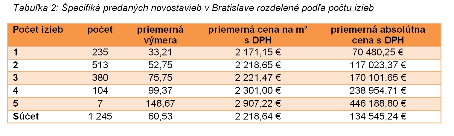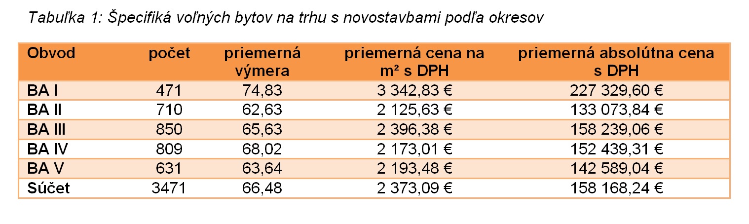 Z hľadiska absolútnej ceny dosiahli voľné byty v priemere 158 tisíc eur s DPH, čo takisto predstavuje nárast (medzikvartálne o 1,5% a medziročne o 4,8%). Rastúca jednotková cena bytov ťahala nahor aj tú absolútnu, jej tempo rastu však spomalil pokles priemernej rozlohy bytov.