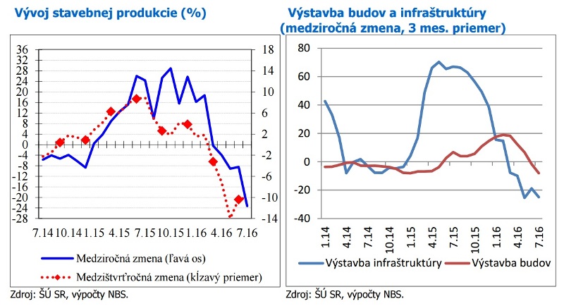 Rekordný prepad priemyslu zapríčinili letné dovolenky v automobilovom priemysle. Výrazný pokles priemyslu ovplyvnili letné celozávodné dovolenky v troch automobilkách. V júli 2016 sa podľa odhadu mohlo vyrobiť o približne 43 tisíc áut menej. V porovnaní s minulými rokmi bolo dovoleniek viac a boli sústredené prevažne do jedného mesiaca. Útlm vo výrobe však zaznamenal aj zvyšok priemyslu. Stavebníctvo taktiež výrazne klesalo. Napriek prudkému poklesu vývoj v priemysle nie je v rozpore s očakávaniami vývoja ekonomiky podľa prognózy NBS P2Q 2016. Výpadok automobilového priemyslu možno vnímať ako jednorazovú záležitosť. Ani na našich významných exportných trhoch zatiaľ nevidieť výraznejší pokles dopytu. Budúci mesiac tak možno očakávať korekciu a rýchlejší rast celého priemyslu. Navyše, letné odstávky sú využívané aj na realizáciu zmien, ktoré súvisia s budúcou výrobou nového modelu (PSA Peugeot-Citroen) alebo s modernizáciou existujúcich modelov (VW). Tieto zmeny by sa v nasledujúcom období mali prejaviť vo zvýšenom záujme o nové automobily.