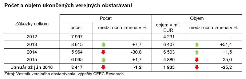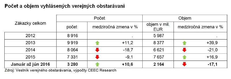 Za prvých šesť mesiacov roka 2016 vyhlásili investori 3 280 verejných obstarávaní v celkovej hodnote 2,16 miliardy EUR, čo predstavuje vôbec najnižší polročný objem investícií za posledné štyri roky, teda za sledované obdobie. Vyplýva to z najnovšej analýzy spracovanej analytickou spoločnosťou CEEC Research na základe údajov poskytnutých Úradom pre verejné obstarávanie ku koncu júna 2016.
