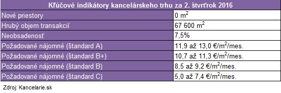 Hrubý realizovaný objem transakcií vrátane prejednaných zmlúv dosiahol v druhom kvartáli 2016 celkovú výmeru viac ako 67 600 m2, pričom uzatvorených bolo 109 zmlúv. Z toho predprenájom priestorov tvorilo 5 % zmlúv, renegociácie 32 % a novo podpísané nájomné zmluvy tvorili až 63 %. Najväčšia renegociácia bola zaznamenaná v Bratislave III. Išlo o výmeru cca 10 600 m2. Najväčšie tri transakcie nových nájmov s celkovou výmerou približne 10 800 m2 boli zaznamenané v Bratislave II. a Bratislave I.