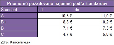 Priemerná požadovaná výška nájmu voľných kancelárskych priestorov v Bratislave je bez prekvapenia stabilná. Jedinou zmenou oproti prvému štvrťroku je tak iba pokles spodnej hranice nájomného pri štandarde C, kde zo 6,9 € m2/ mesiac klesla suma na 5,0 € m2/ mesiac.