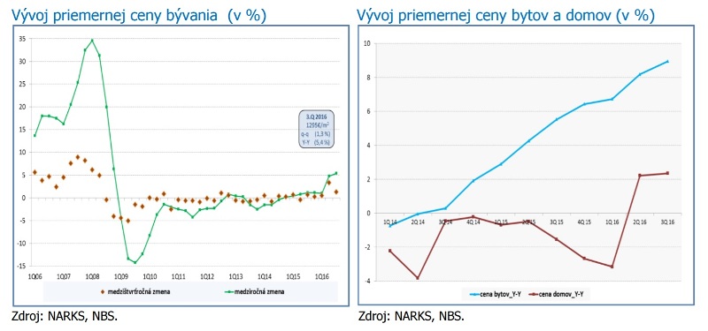 Pre 3. štvrťrok 2016 je charakteristický pretrvávajúci dynamický rast priemernej ceny bytov (medziročne o 9 % z 8,2 % v 2. štvrťroku) a spomalenie rastu priemernej ceny domov (o 2 % z 2,2 % v 2. štvrťroku). Medziročne najvýraznejšie vzrástla priemerná cena jednoizbových bytov (o vyše 11 %) a najpomalšie priemerná cena päťizbových bytov (o zhruba 5 %).