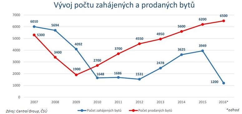 Nabídka nových bytů klesla v průběhu letošního roku podle analýzy společností Central Group, Trigemy a Skanska Reality o 22 % na rekordně nízkých 4 300 bytů. Vzhledem k celkovému zvýšení cenové hladiny spadají navíc zhruba tři čtvrtiny nabízených bytů do nejvyššího cenového segmentu, tedy nad 60 000 Kč korun za m2. Pro velkou část domácností ovšem tyto byty nejsou právě kvůli vysokým cenám dostupné. Reálná nabídka bytů dosažitelných pro běžné domácnosti tak činí jen asi 1 200 bytů.