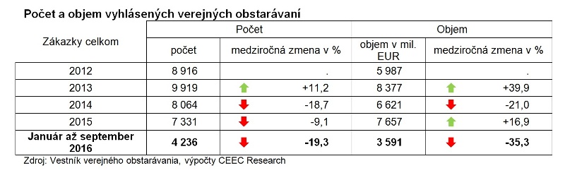 Od januára do septembra tohto roka vyhlásili investori 4 236 verejných obstarávaní v celkovej hodnote 3,6 miliardy EUR, čo predstavuje najmenší objem investícií za posledné štyri roky. Aktivita investorov v ukončovaní verejných obstarávaní vykazuje rovnako dlhodobo zápornú bilanciu, pričom zákaziek bolo doposiaľ firmám zadaných o štvrtinu menej než vlani. Vyplýva to z najnovšej analýzy spracovanej analytickou spoločnosťou CEEC Research na základe údajov poskytnutých Úradom pre verejné obstarávanie ku koncu septembra 2016.