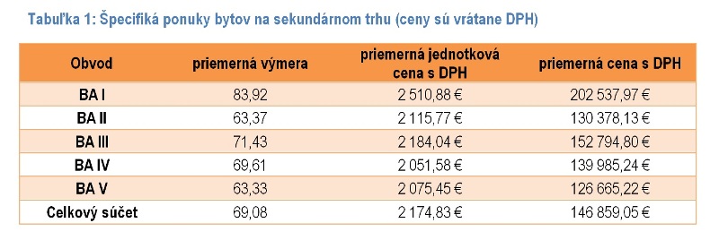 Absolútne ceny závisia od rozlohy ponúkaných bytov. Tá oproti predchádzajúcemu štvrťroku v priemere dosť výrazne klesla z 74 na 69 m², t. j. o 7%. K poklesu rozlohy bytov došlo vo všetkých okresoch naraz, pričom najväčší pokles majú za sebou BA I, BA V a BA III (8–12%). V prípade Starého mesta ide o prepad z normálneho stavu, ktorý bol pravdepodobne spôsobený výpredajom niekoľkých veľkých a luxusnejších bytov, zatiaľ čo dopyt po bytoch o strednej veľkosti napĺňali novostavby a staršie byty tak ostávali v ponuke.